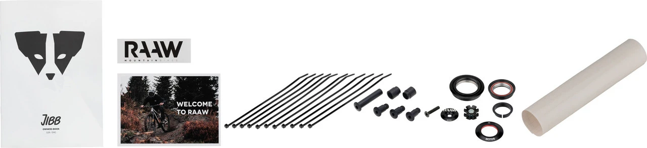 Comme pour le Madonna V2.2, RAAW mise désormais sur son propre système d’axe traversant pour le Jibb, ce qui augmente la rigidité et empêche l’axe de se desserrer pendant que tu roules. La conception du cadre favorise un style de conduite actif et te confère confiance et contrôle. La géométrie équilibrée permet une position de conduite centrale et garantit une traction suffisante. Le même souci du détail est évident sur le Jibb que sur son vélo frère, le Madonna. Par exemple, le support de frein sur le Jibb est également un élément séparé. Tu n’as donc pas besoin d’adaptateurs supplémentaires pour les différentes tailles de disques de frein et l’alignement précis de l’étrier de frein ne pose aucun problème. Deux filetages pour vis sur le tube supérieur permettent de fixer une sacoche (pas incluse à la livraison) pour les outils et autres accessoires, tu as ainsi toujours l’essentiel avec toi. Le matériel nécessaire pour l’amortisseur est déjà inclus, tu n’auras donc pas besoin de bagues. Tu obtiendras également un axe traversant, un jeu de direction, une attache de selle et un set de films de protection, qui sont d’autres éléments nécessaires pour créer ton vélo.
